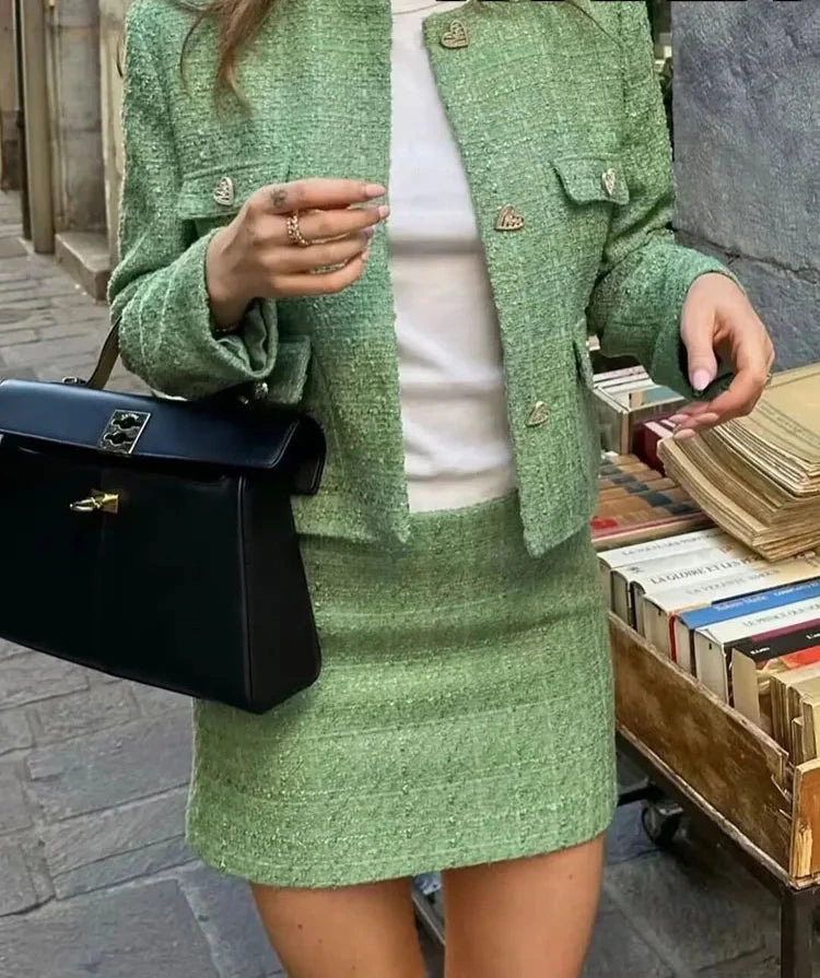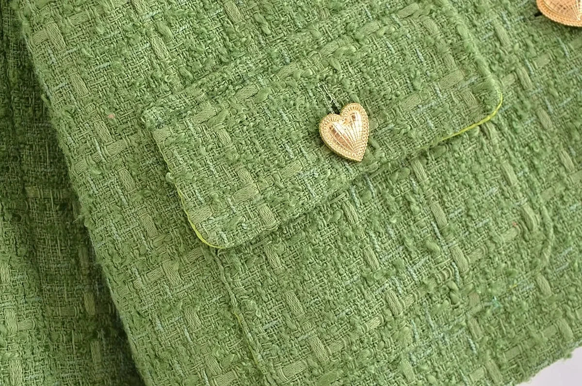 Elevate your fall and winter wardrobe with this chic Tweed Mini Suit, featuring a stylish single-breasted jacket with heart-shaped buttons and a matching mini skirt. Designed to exude elegance and sophistication, this suit is perfect for both casual outings and semi-formal events.