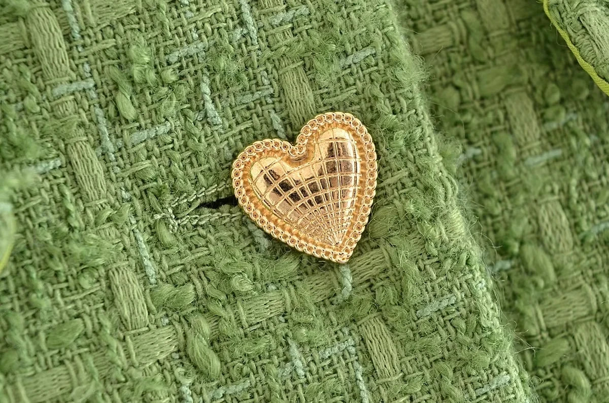 - Single-Breasted Jacket: The jacket is crafted from high-quality tweed and features a unique heart-shaped button design that adds a playful, feminine touch.