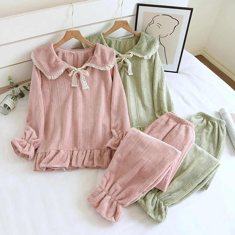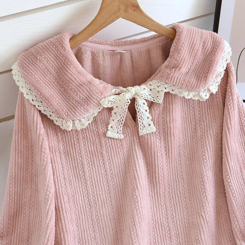 Women's Autumn Winter Flannel Pajama - Lace Details Blouse and Trousers Pajama Set
