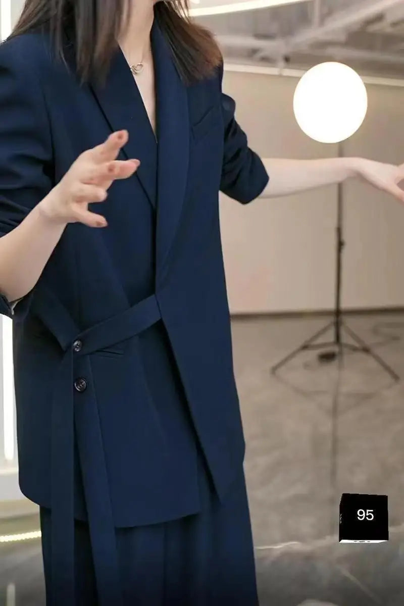 Wide Leg Trousers: Accompanying the blazer are wide-leg trousers that offer both comfort and style. The wide-leg design provides a modern and chic aesthetic while allowing for ease of movement and versatility in styling.