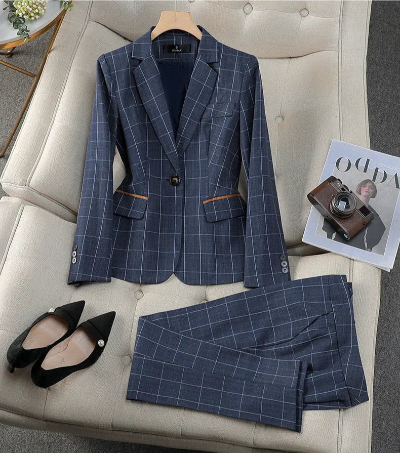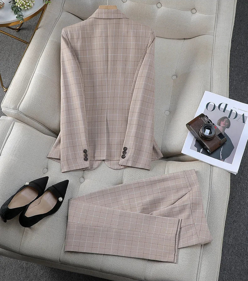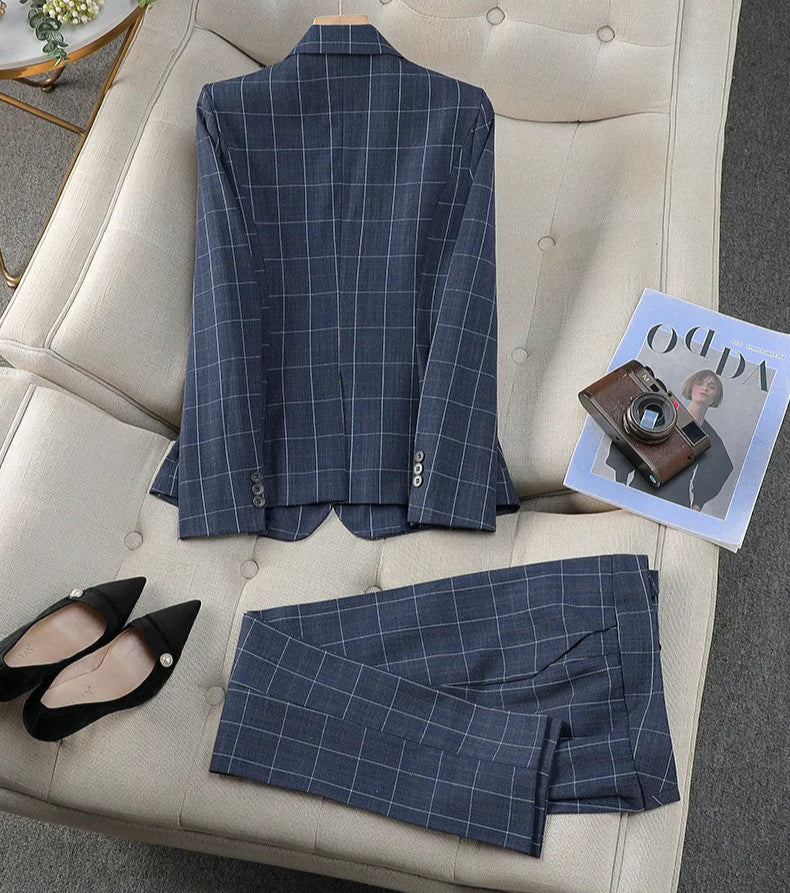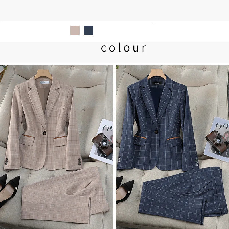 Make a bold yet timeless statement with our Women’s Plaid Pantsuits, available in chic light beige or classic navy blue. Designed with a notched collar blazer and straight-cut trousers, this suit blends elegance and modern tailoring for a versatile wardrobe essential.